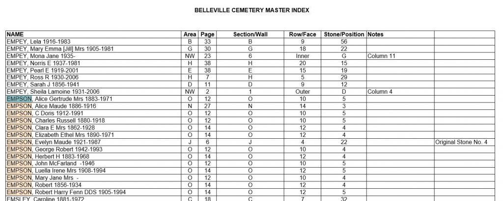Empson Burials in the Belleville Cemetery, OGS Transcription
