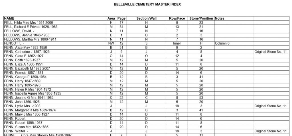 Fenn Burials in the Belleville Cemetery, OGS Transcription