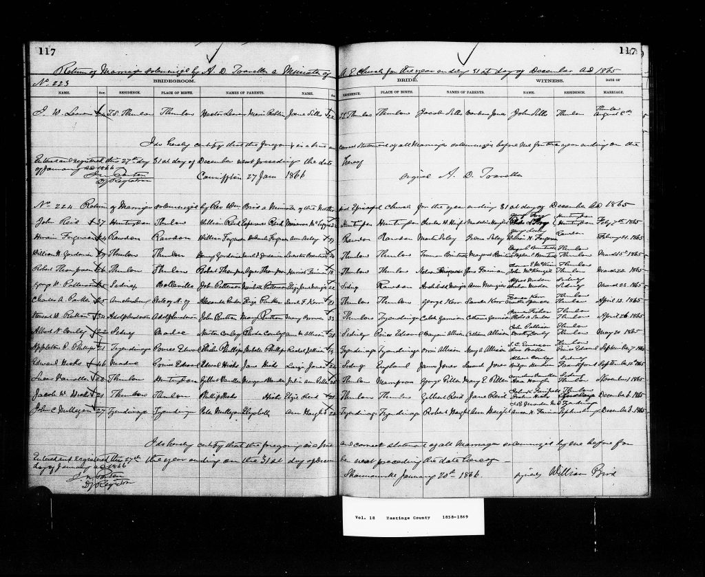 The 1851 Census of Canada West shows four members of the Patterson family. John Patterson (52), Jane Patterson (54), George W. Patterson (22) and Mary Ann Patterson (15). [Note: ages are as of next birthday] Although no family relationships are clearly identified in the census, it is assumed that Mary Ann Patterson is a daughter to John and Jane and a sister to George. The 1861 Census of Canada West for Sidney Township is unreadable, and therefore any pertinent information is for the moment lost. By the time of the 1871 Census of Canada, John and Jane Patterson are deceased and both George and Mary Ann appear to be married and on their own. Some Internet sources suggest that Mary Ann Patterson married Benjamin F. Foster. County Marriage Registers show Benjamin F. Foster (26) marrying M. A. Patterson (24) on 14 February 1861 in Sidney Township. M. A. Patterson’s age is consistent with that of Mary Ann Patterson and her father is noted as John. This researcher believes that this evidence strongly points to the fact that Mary Ann Patterson married Benjamin F. Foster in 1861. [Note: The “Death Roll” published in the Daily Intelligencer newspaper on 7 January 1899 notes the death of a Benjamin Foster on 7 February 1898.]